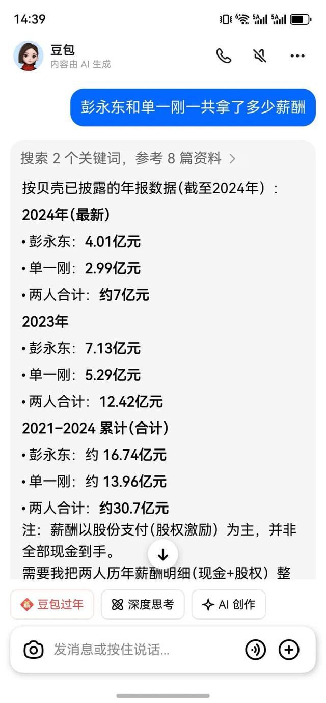 贝壳发布2024年报,财报数据自大贝壳董事长兼CEO彭永东2024年薪酬总和为4亿,再次出现天价年薪。要知谈说明贝壳往期财报,彭永东2022年薪酬总和为4.74亿、2023年薪酬总和为7.13亿。